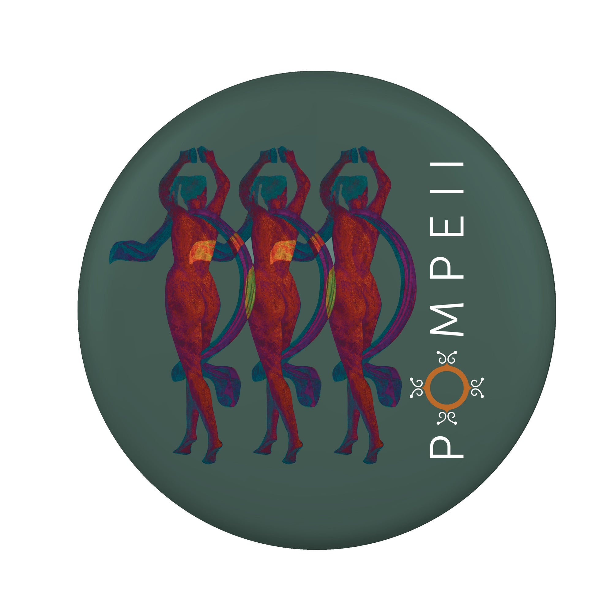 Spilla circolare in alluminio con motivo decorativo. Riproduzione di un particolare della megalografia della villa dei Misteri